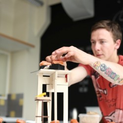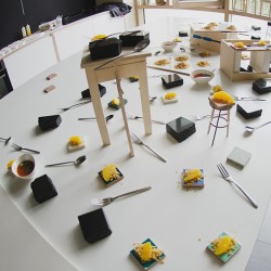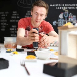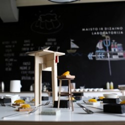 Įkvepiamą savo karjeros istoriją papasakojęs šefas tarptautinio konkurso „Electrolux Design Lab“ dalyviams ne atskleidė įvairių užkandžių gamybos paslaptis, bet ir serviravimui pasitelkė dizaino studentų kurtų kėdžių mini prototipus bei kitus tradicinei virtuvei neįprastus elementus.